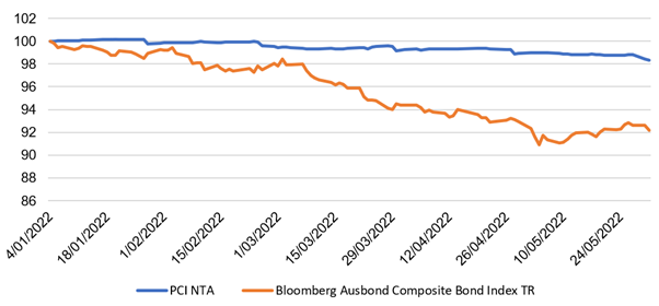 Absolute returns of the Perpetual Credit Income Trust (PCI) portfolio over the 1 month, 3 months and 1 year to 30 April 2022 were +0.1%, +0.3% and +2.4% respectively. These returns reflect very favourably against the official benchmark of the portfolio, which is the RBA Cash Rate benchmark, but they also compare exceptionally well against the Bloomberg AusBond Composite Index, which is down -1.49%, -6.33% and -7.47% over the same periods. Fixed rate bonds have endured a torrid run with the Bloomberg global and Ausbond Composites posting their worst ever start to year. Allocation to floating rate credit during this time has been well rewarded. The below chart compares the value of the Trust’s assets (The NTA) against the index level of the Bloomberg Ausbond Composite Bond index, a broadmarket fixed rate bond index, over the first 5 months of 2022. While the Trust is not benchmarked against the Ausbond Composite, the performance differential is useful to highlight what exceptional defensive characteristics floating rate credit continues to deliver in conditions hallmarked by rampant inflation and monetary policy tightening.