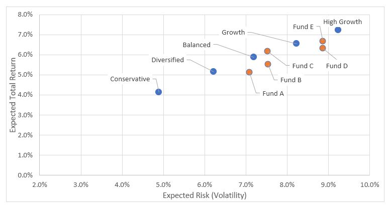 The graph below shows expected risk versus return characteristics of the ‘Balanced’ investment option for five industry superannuation funds (red dots) when compared to Perpetual Private’s core risk profiles (blue dots). For each portfolio, the figures shown are calculated using risk and return estimates for the underlying asset classes, then aggregated to a total portfolio level using the asset allocation.
